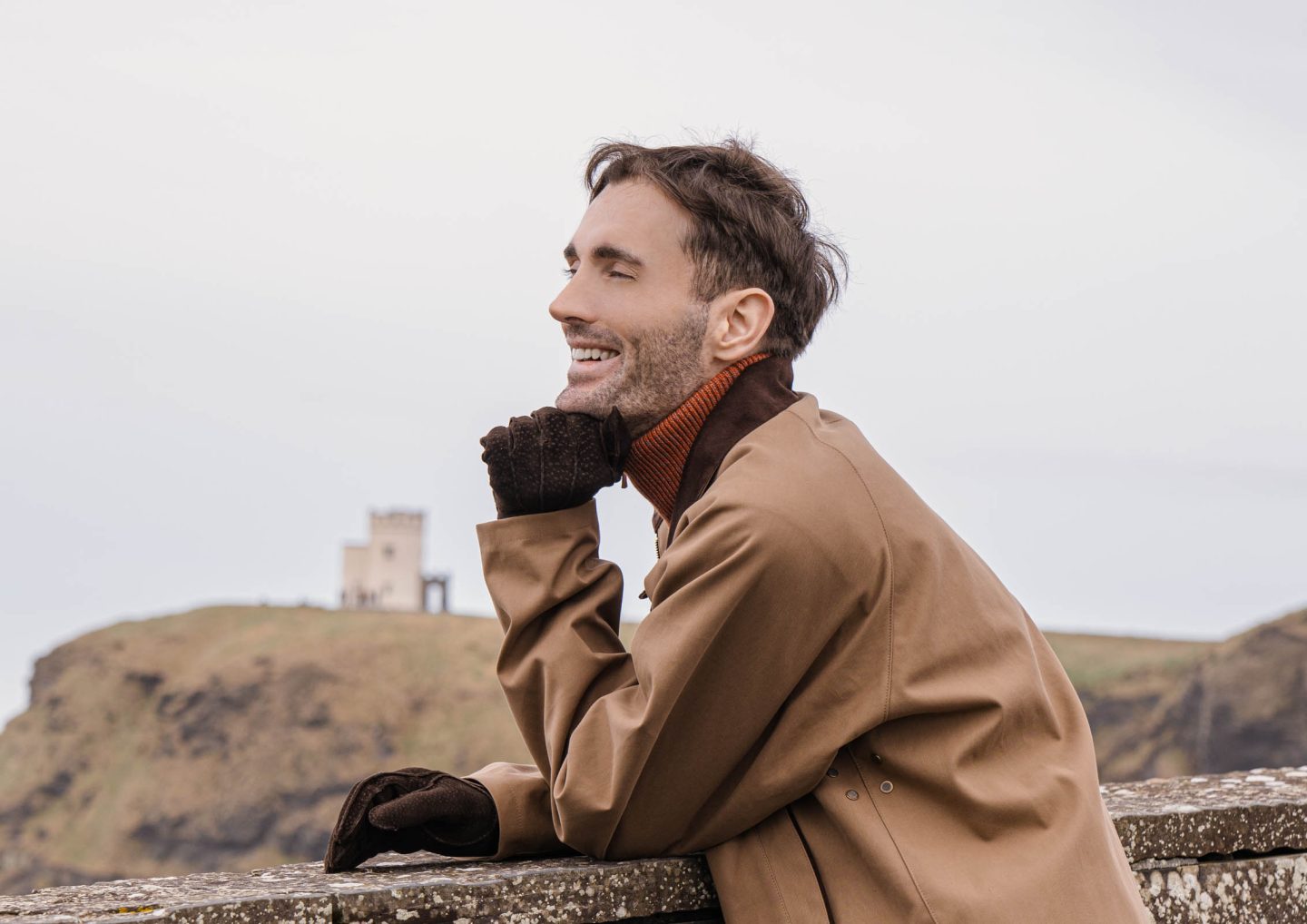 Moja poseta ovim čudesnim liticama bio je poseban iz više razloga. Pre svega, tu sam na jedan neobičan način spojio sirovu snagu prirode i suptilnu sofisticiranost luksuzne mode, a svaka fotografija nastala na ovom mestu nosi u sebi dah okeanskog vetra i toplinu pažljivo odabranih komada odeće. Moj outfit za ovu modnu priču sastojao se od Mackintosh Ireland by Francis Campelli kabanice sa uloškom, Aida Barni kašmirskog džempera, braon peccary kožnih rukavica brenda Restelli Guanti, farmerki Brunello Cucinelli i patika u istoj braon nijansi kao i rukavice brenda Frattelli Rossetti. Svaki od ovih komada imao je svoju ulogu u stvaranju jedne modne priče koja je spojila eleganciju, udobnost, lepotu putovanja i modu.