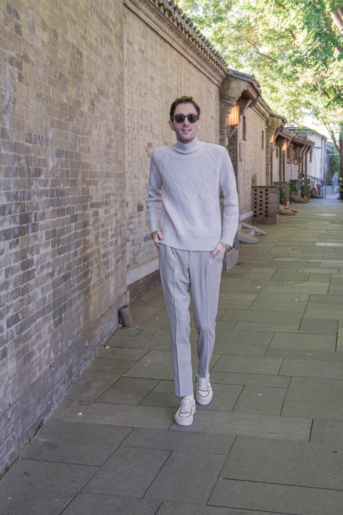 Monohromatska bež paleta mi dozvoljava da budem prisutan bez dominiranja ili nestajanja u njemu. Neutralni tonovi stvaraju vizuelni prostor za disanje, dopuštaju arhitektonskoj veličanstvenosti Zabranjenog Grada da bude zvezda dok ja ostajem prisutan bez nametanja. Istovremeno, izbor svih luksuznih komada u različitim nijansama iste palete boja demonstrira sofisticirano razumevanje muške mode, to nije lakši način oblačenja već zapravo teži jer zahteva preciznu kalibraciju nijansi, tekstura i kroja jer namte kontrast da sakrijete nesavršenosti.