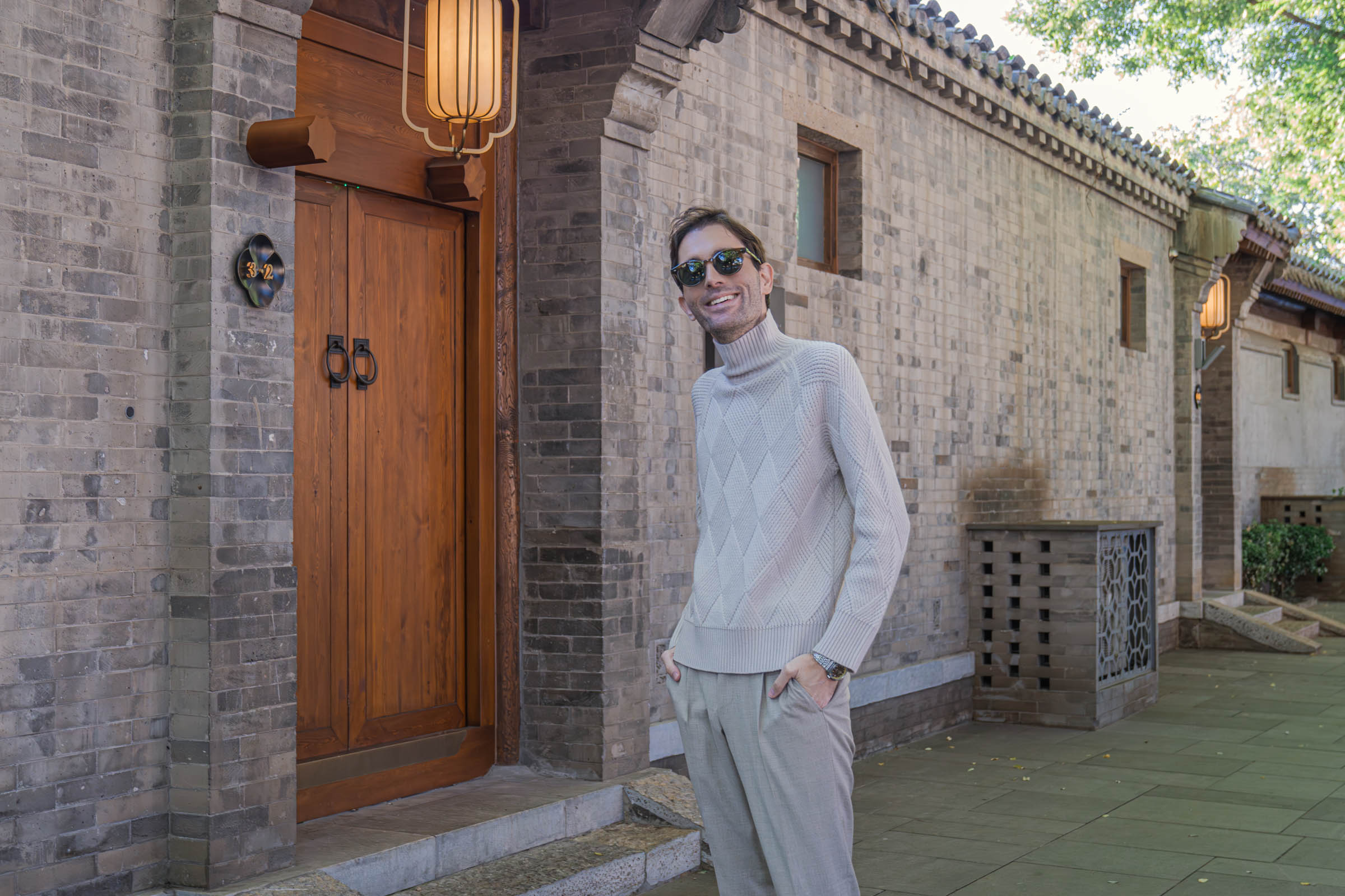 Fotografišući kombinaciju u dvorišnim okruženjima Mandarin Oriental Qianmen, stvaram paralelnu sliku između onoga što nosim i gde sam. ALPHA STUDIO merino rolka sa svojim toskanskim nasleđem susreće pekinšku arhitekturu dvorišta. Loro Piana pantalone sa svojim italijanskim pedantnim majstorstvom nasuprot tradicionalne kineske arhitekture. Carlos Santos portugalske kožne patike koračaju po kamenim pločnicima dvorišta starim vekovima. Ovaj tip kulturnog ukrštanja, nošenje evropskog luksuza u azijskom istorijskom orkuženju, dokazuje da pravi kvalitet prevazilazi geografske granice.