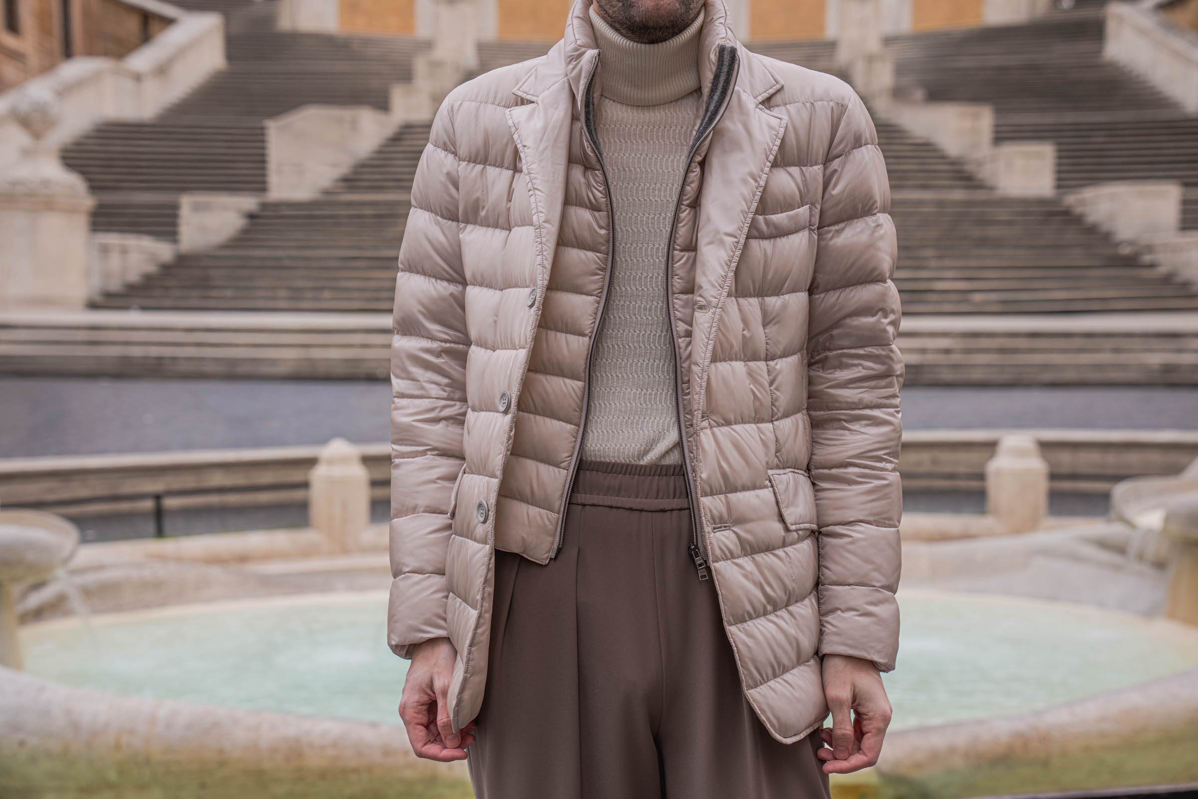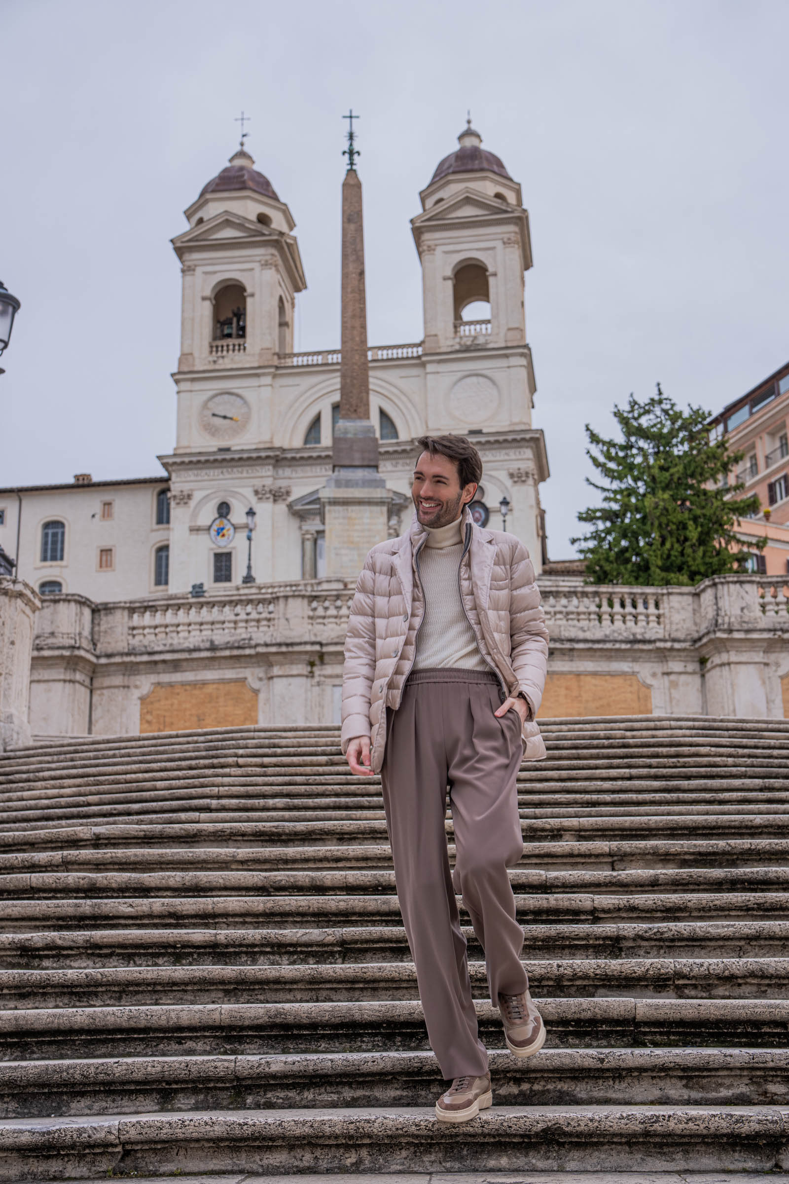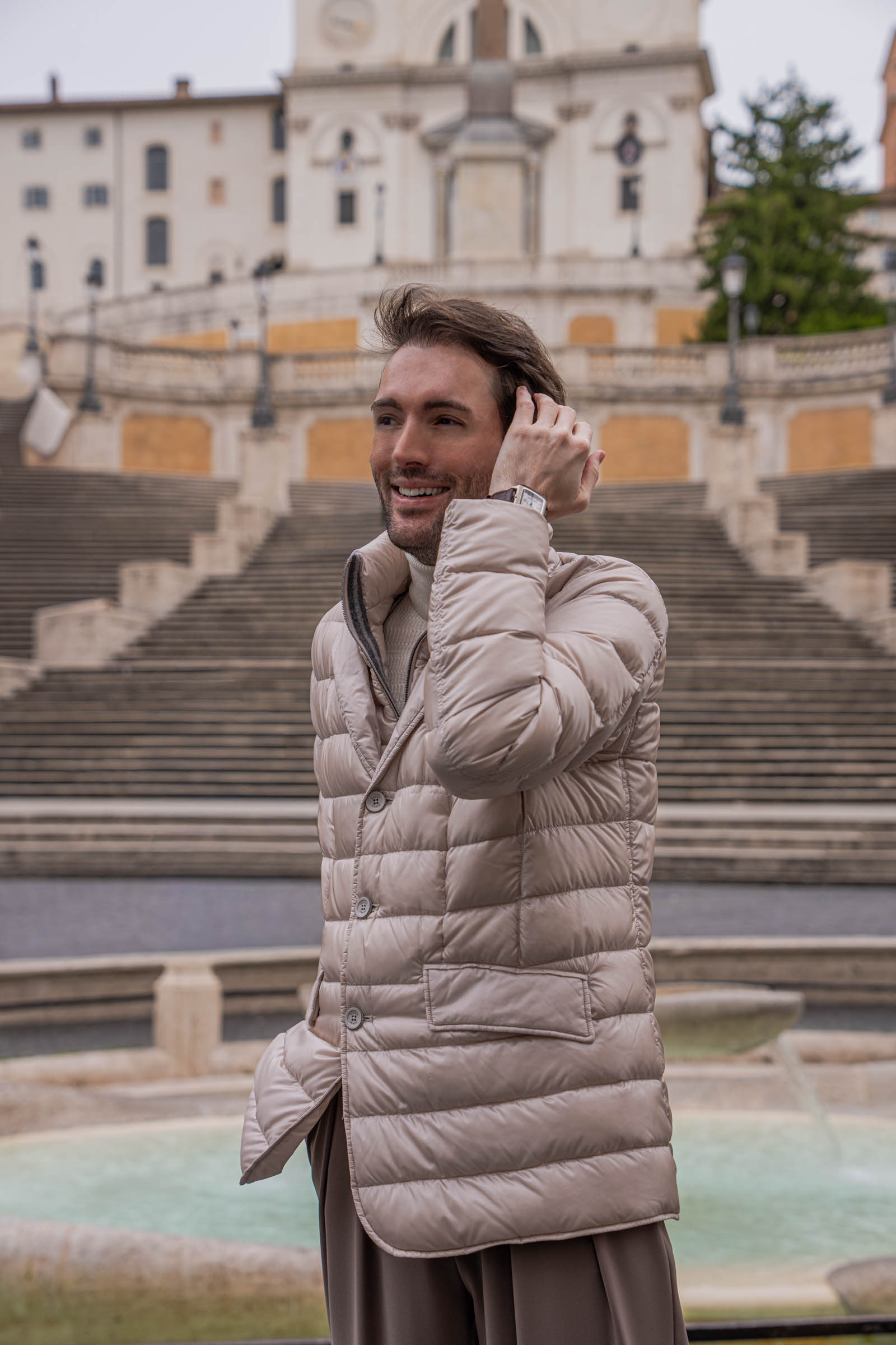 Upravo ta sposobnost da se perjana jakna nosi uz široke elegantne pantalone i kašmirsku rolku, bez gubitka sofisticiranosti, čini Herno posebnim brendom. Jakna izgleda podjednako dobro na stepenicama ispred crkve Trinita dei Monti kao i na jutarnjoj šetnji uz Tibar. Ta svestranost je ono što muškarac koji putuje zaista traži od svog garderobera.