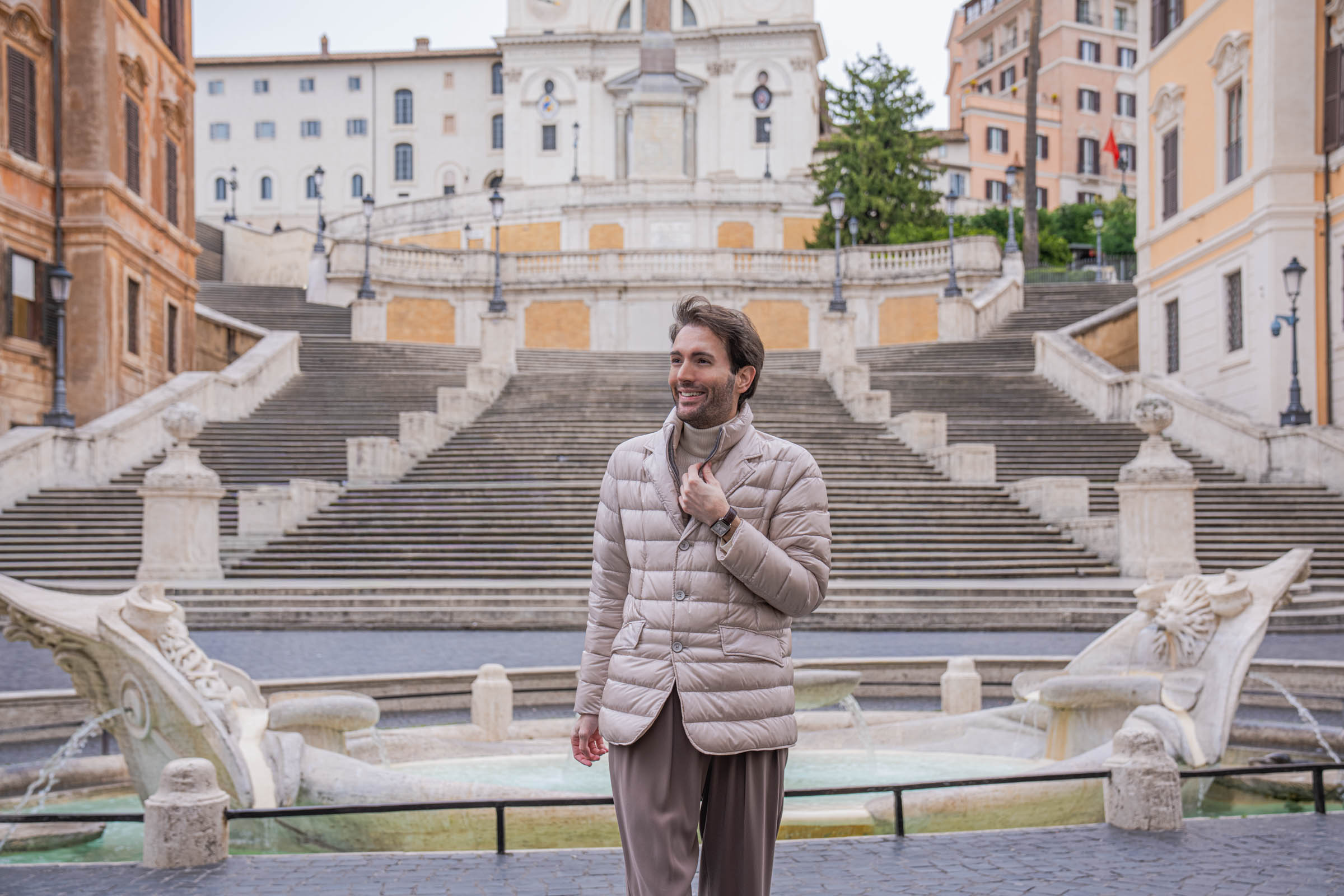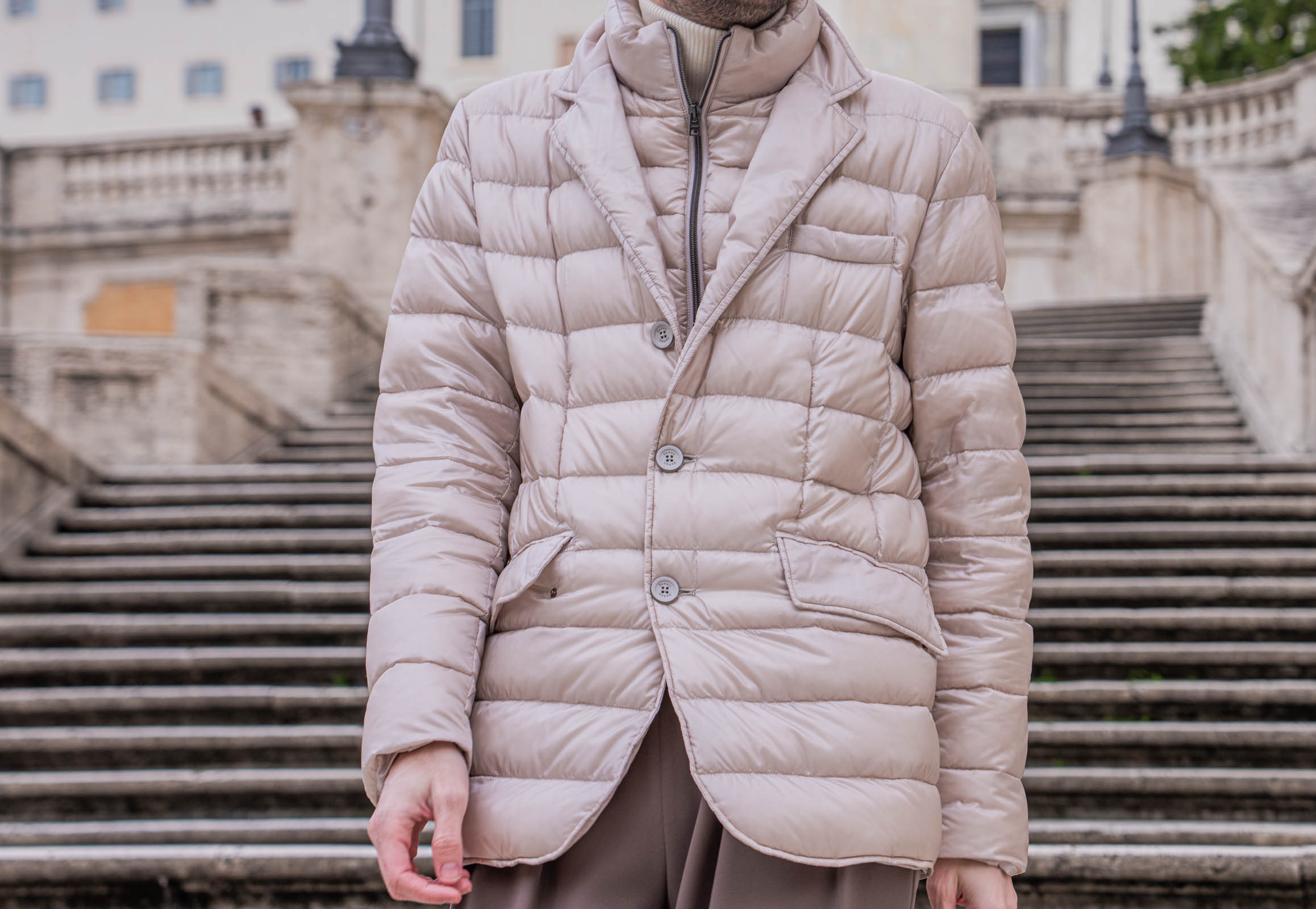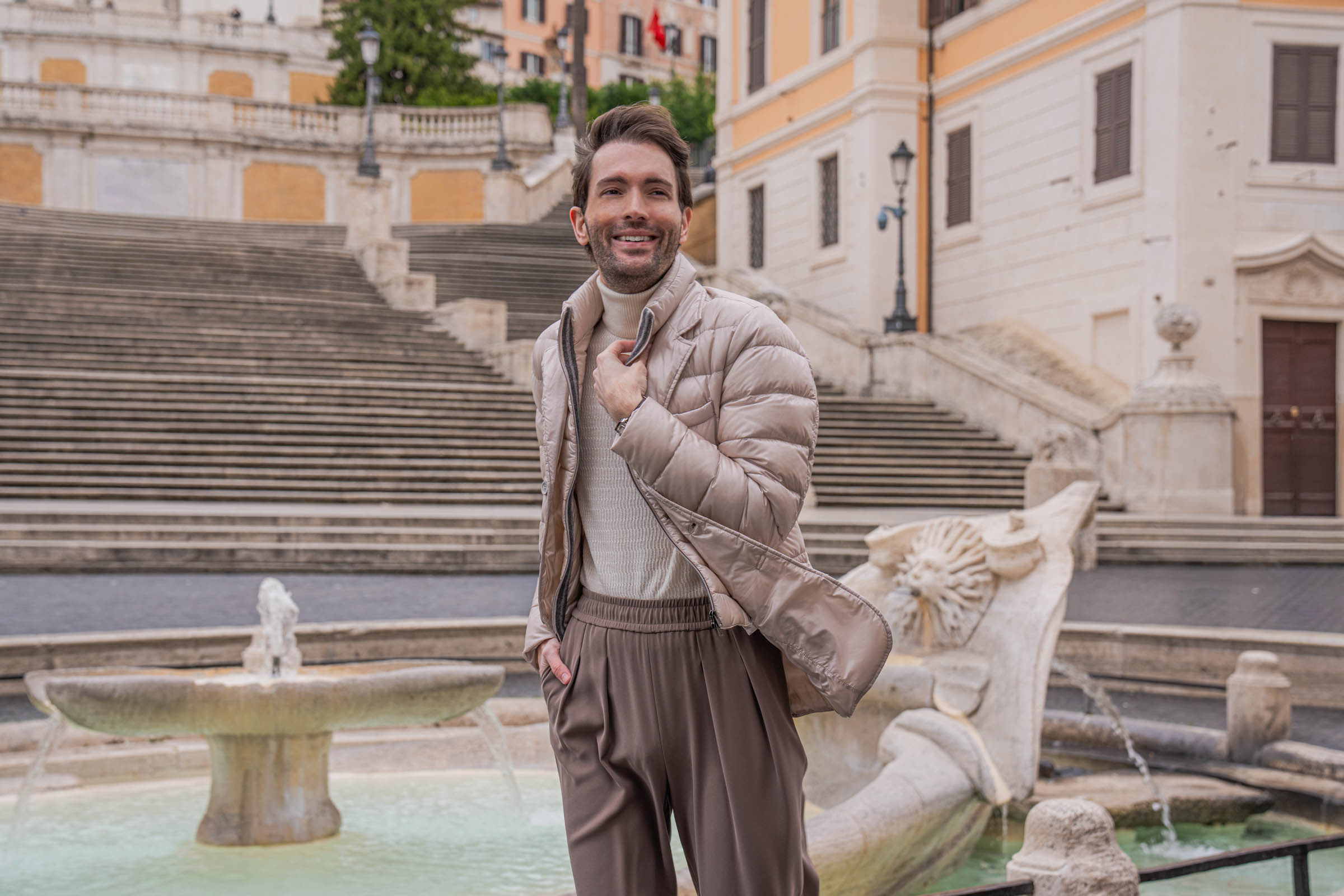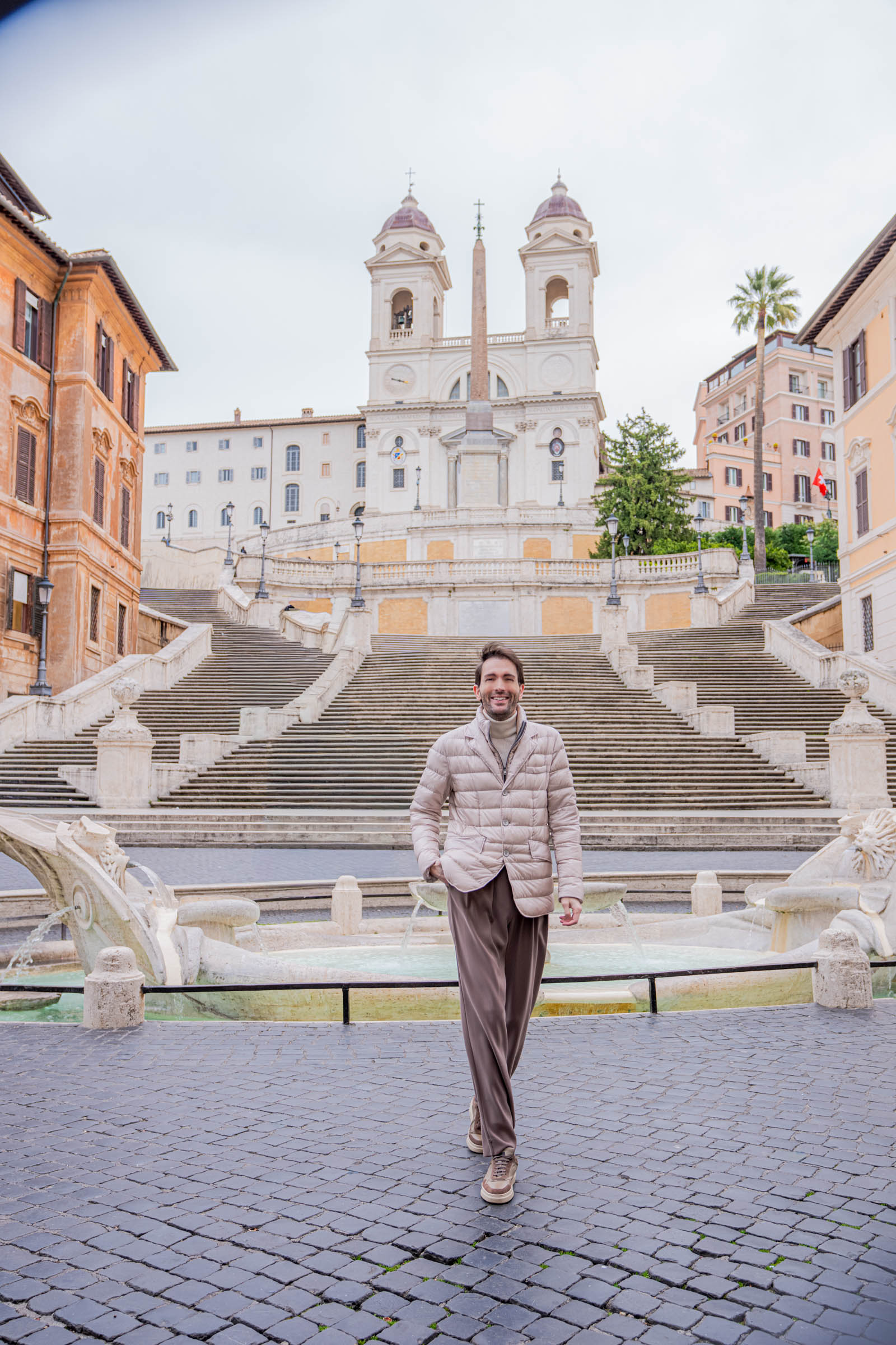 Upravo ta sposobnost da se perjana jakna nosi uz široke elegantne pantalone i kašmirsku rolku, bez gubitka sofisticiranosti, čini Herno posebnim brendom. Jakna izgleda podjednako dobro na stepenicama ispred crkve Trinita dei Monti kao i na jutarnjoj šetnji uz Tibar. Ta svestranost je ono što muškarac koji putuje zaista traži od svog garderobera.