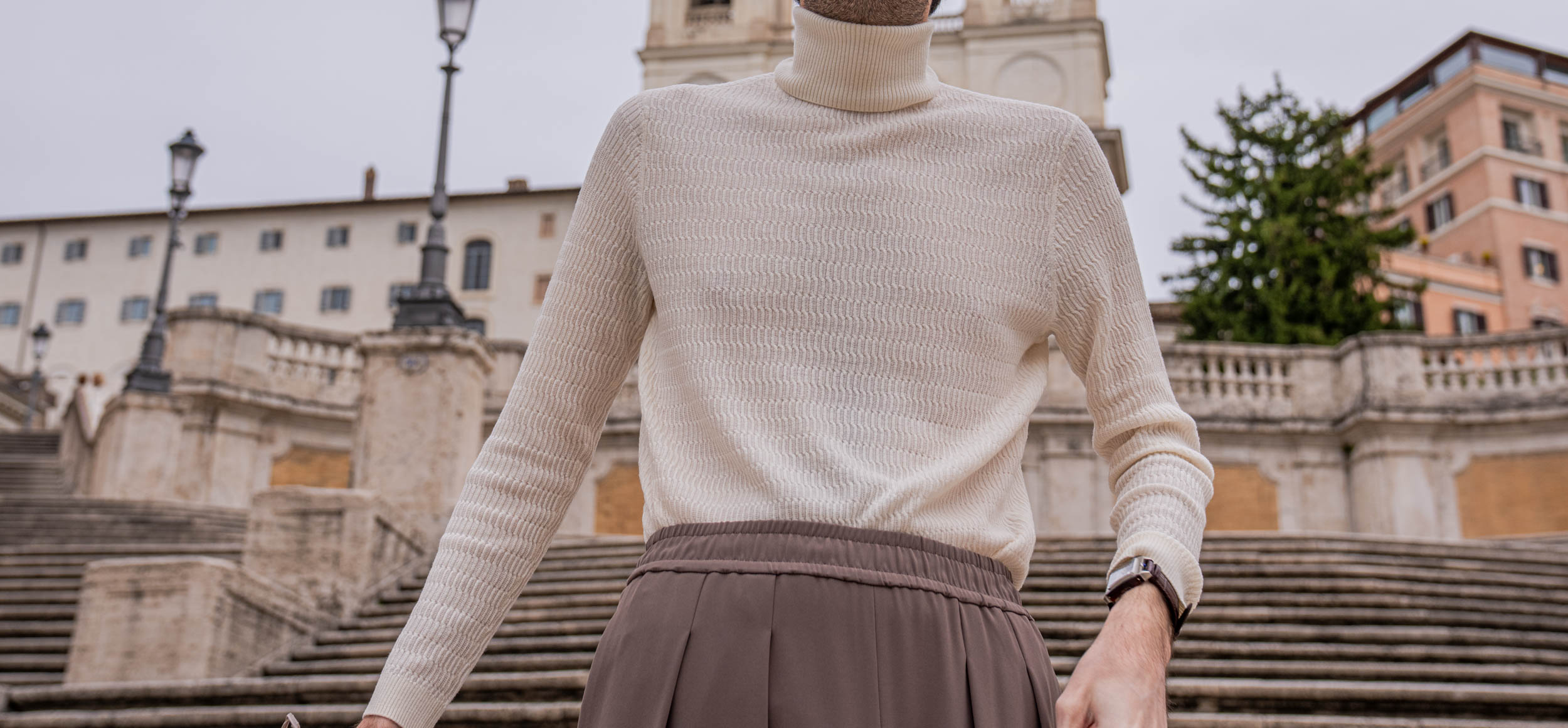 Armani je jednom rekao da je prvi omekšao sliku muškarca u modi. Ta filozofija se jasno čita u ovoj rolci mekoća kašmira, visoka kragna koja štiti od jutarnjeg rimskog vetra i reljefna obrada koja daje karakter inače jednostavnom komadu. Bež ton savršeno se uklapa u paletu ostatka izdanja, od svetlije Herno jakne do tamnijih pantalona. Reljefni rad na površini rolke podseća na talase ili valovite linije, što daje trodimenzionalni efekat koji se posebno lepo vidi na detaljnim fotografijama.