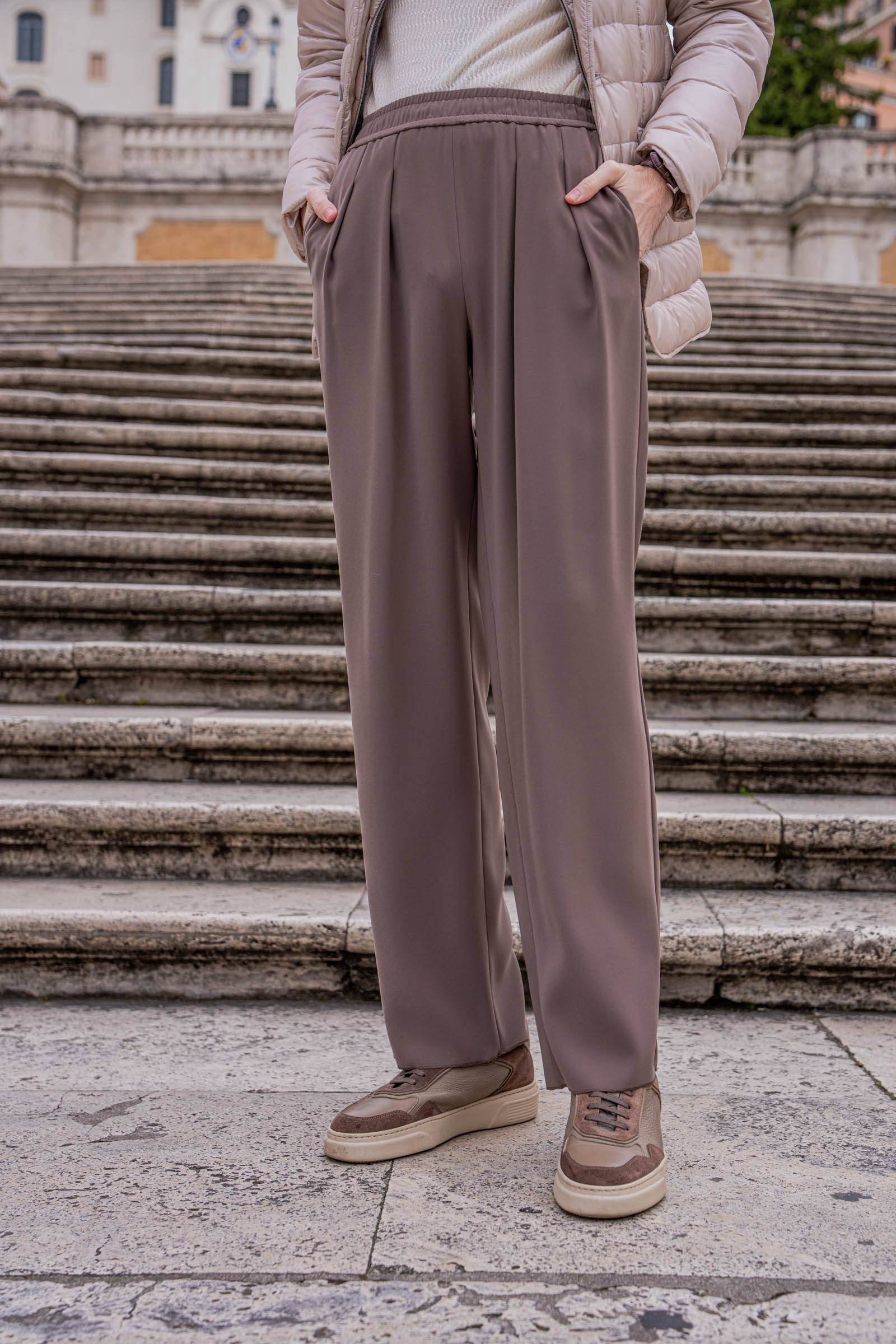 Široke pantalone iz iste kolekcije Giorgio Armani predstavljaju savremenu interpretaciju klasičnog kroja. Struk je sa elastičnom trakom, što pruža udobnost tokom dugih šetnji, dok duboke falte daju elegantnu proporciju celoj silueti. Materijal ima blag sjaj koji odlično reaguje na rimsku svetlost, posebno u ranim jutarnjim satima kada smo snimali na Španskim stepenicama.