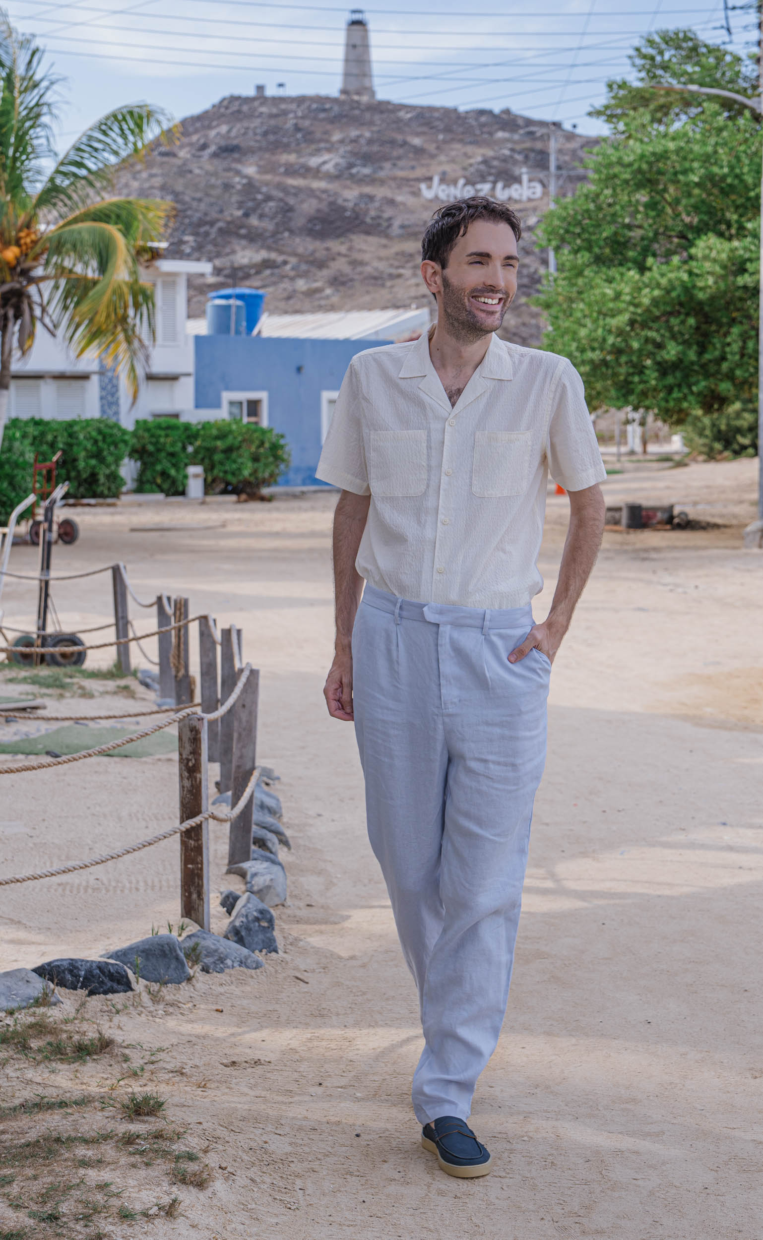 Baby plava boja ovih Jil Sander pantalona nije slučajna. Ova nijansa plave je negde između boje neba na zalazu sunca i površine okeana pod podnevnim suncem. U Los Roques, gde su nebo i voda stalni saputnici, ova boja je delovala kao prirodni dodatak ovom pejzažu. Nisam nosio garderobu koja se ističe, nosio sam odeću koja se integriše.