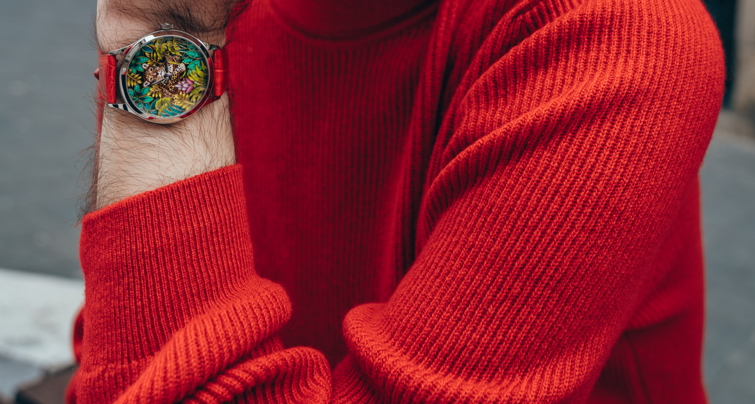Ovaj zanimljivi crveni sat osim što verno pokazuje vreme predstavlja i pravo malo umetničko delo koje može krasiti svačiju ruku. Moj novi prijatelj Jaguar je iz specijalne kolekcije “Kraljevstvo” (Životinjsko carstvo). Ovaj sat je ručno napravljen u dalekoj Kanadi u glavnoj radionici Ematelier-a, brenda iza kojeg stoji strastveni ljubitelj satova, osnivač Aleks Landa.