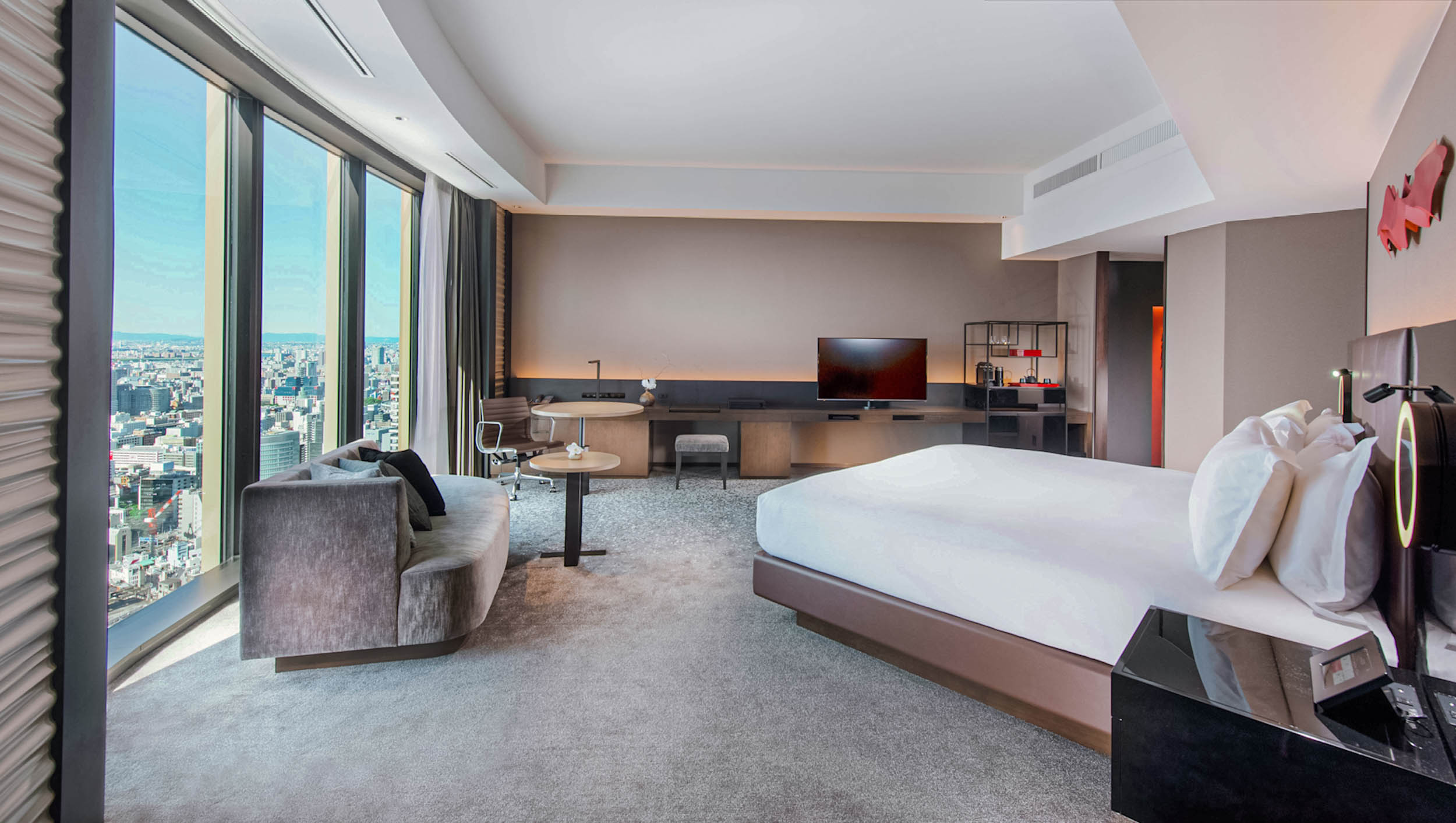 Tokom boravka u Osaki imao sam privilegiju da odsednem u hotelu Conrad Osaka, jednom od najluksuznijih hotela u gradu koji nosi koncept “Vaša adresa na nebu”. Hotel se nalazi na najvišim spratovima od 33. do 40. tornja Nakanošima Festival West, arhitektonskog remek-dela u poslovnoj četvrti grada. Sa 200 metara iznad zemlje, pogled se pruža na planine u daljini, zgrade Osake, more u koje se ulivaju vode dveju reka Dođima i Tosabori i beskrajni horizont sa oblacima koji neprestano menjaju oblik. Dizajnirao ga je Hašimoto Jukio Design Studio, isti tim koji stoji iza The Peninsula Tokyo i InterContinental Osaka.