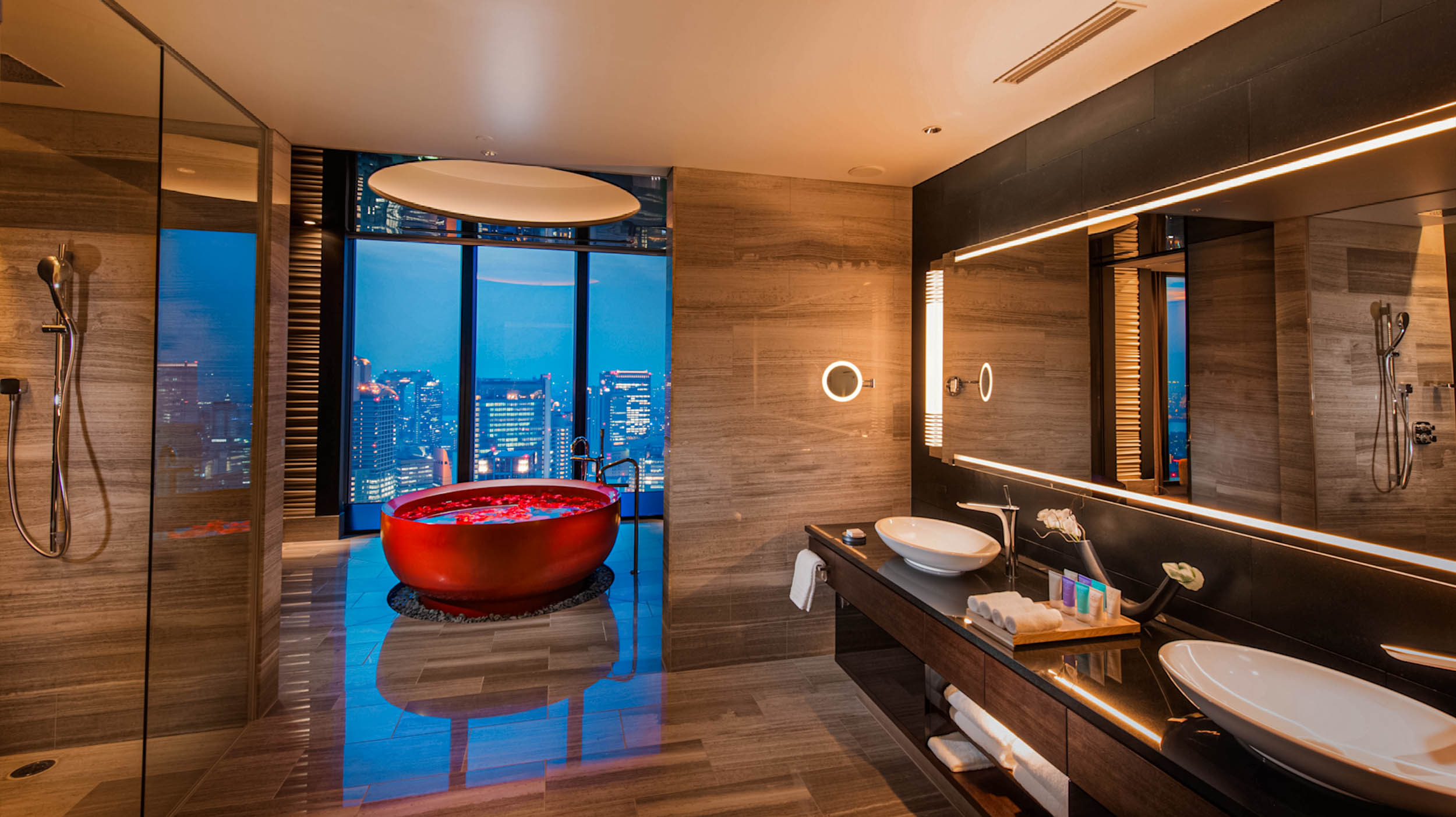 Dizajn sobe spaja modernu eleganciju sa suptilnim japanskim akcentima: tamno drvo, prirodni kamen na podu i crveni lakovani detalji stvaraju atmosferu sofisticiranog mira. Prozori od poda do plafona pružaju nezaboravan pogled na grad Osaku, sa mogućnošću da se u daljini vidi čak i Osaka zamak iz soba okrenutih ka zapadu. Ono što me je posebno oduševilo bila je pažnja posvećena svakom detalju. Pri ulasku u apartman dočekao me je elegantan hodnik koji vodi do prostrane garderobne sobe sa svim potrebnim pogodnostima, od kompleta za peglanje do obilnog broja vešalica. Tu su me čekali i slatki pokloni dobrodošlice, prepoznatljivi Conrad medvedić i gumena patka sa hotelskim logom.
