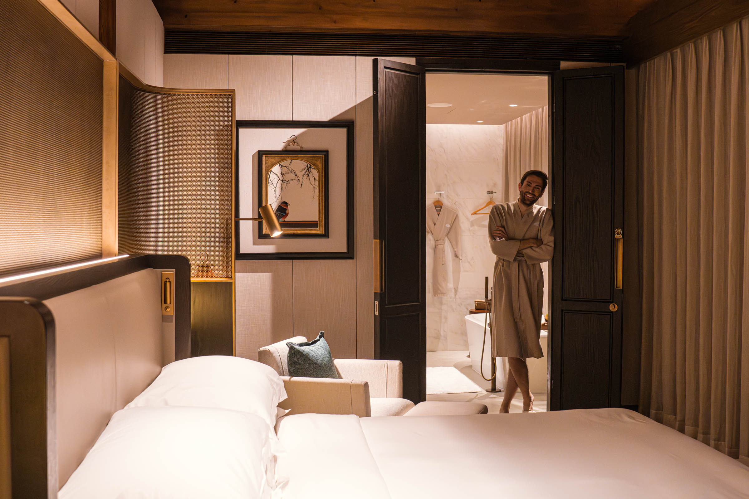 Moja soba ili bolje rečeno moj apartman je san svakog putnika. Prostrana, elegantno dizajnirana sa pažnjom na svaki detalj, savršeno balansira između istočne estetike i zapadnog komfora. Visoki plafoni, ogromni prozori kroz koje prodire svetlost, posebno odabrana umetnička dela na zidovima i nameštaj koji kombinuje tradicionalne kineske elemente sa savremenim linijama. Krevet je možda najudobniji na kojem sam spavao, nakon celog dana hodanja po Kineskom Zidu ili istraživanja hutonga, utonuti u te svilene čaršave je pravo blaženstvo.
