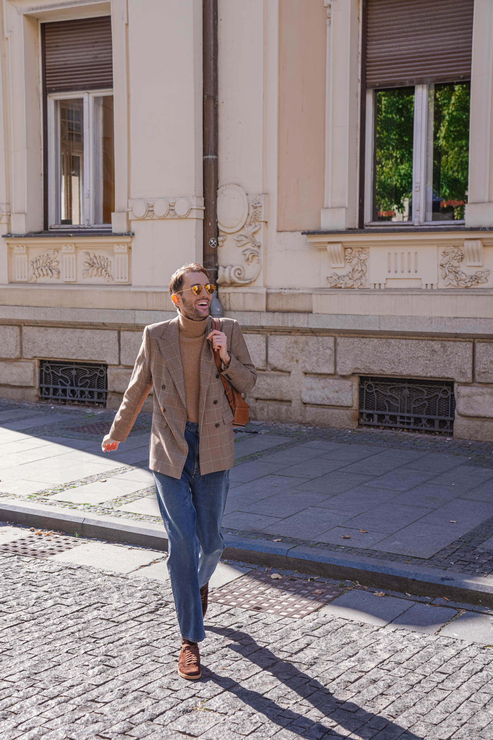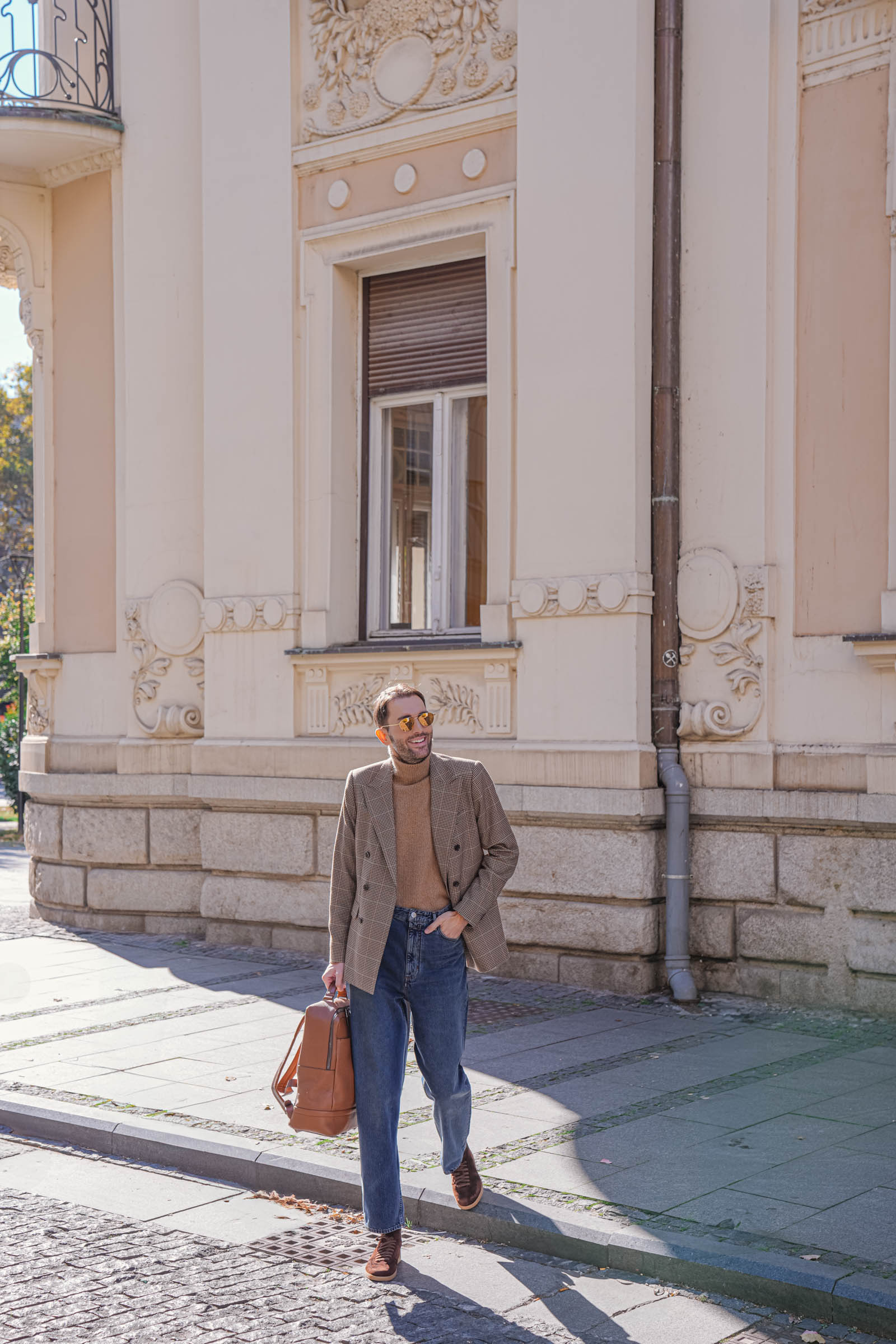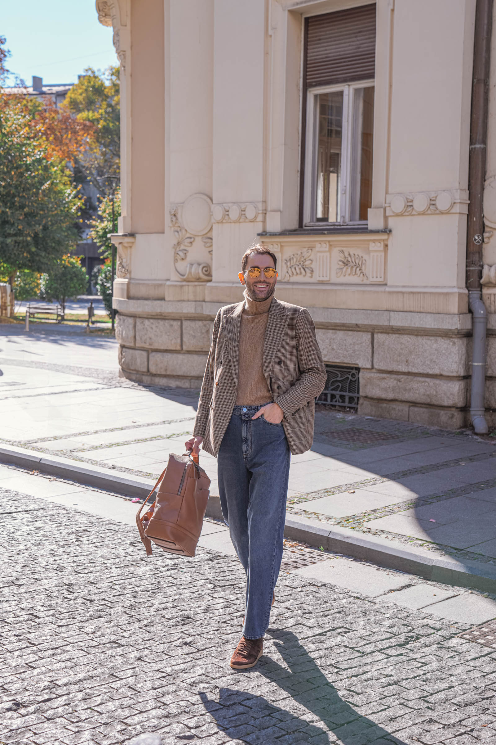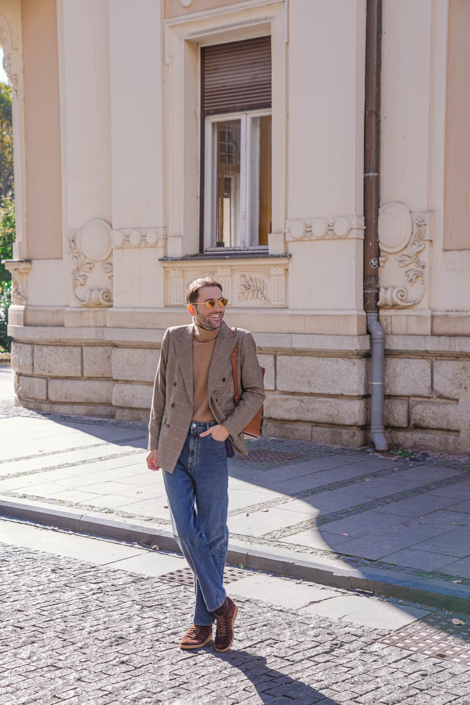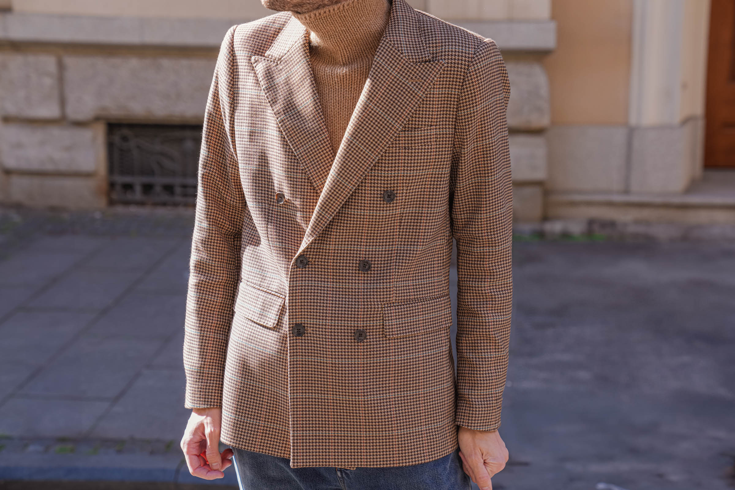Kada nosite izražen print kao što je pepito, ostatak outfita potrudite se da održite jednostavnim. Jednobojni komadi poput ove kamel rolke omogućavaju da sako bude u centru pažnje bez dodatne pretrpanosti.