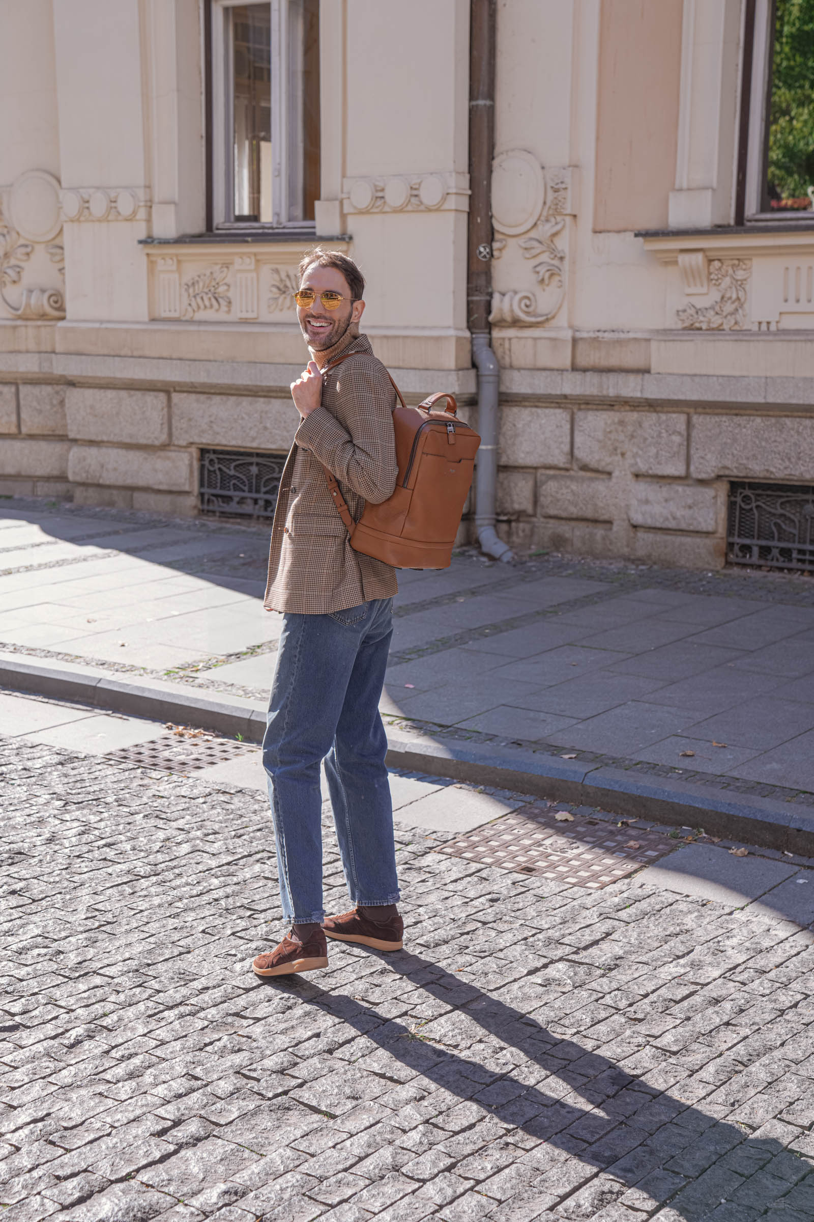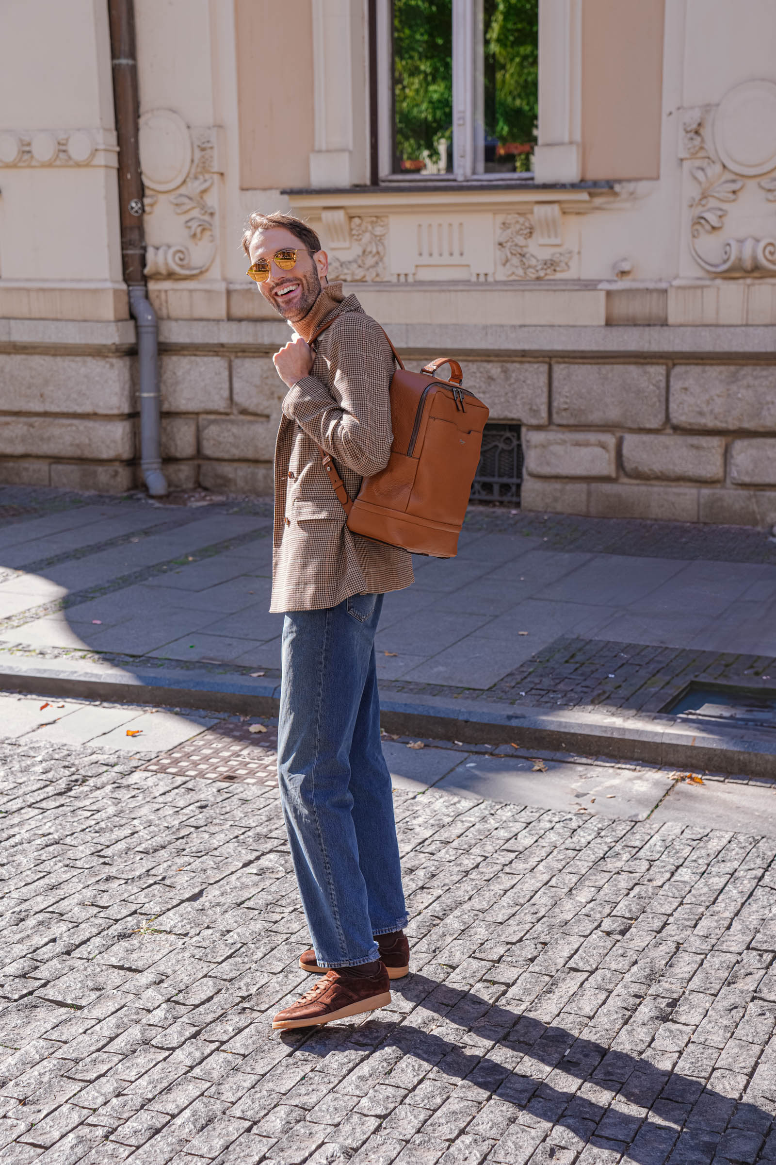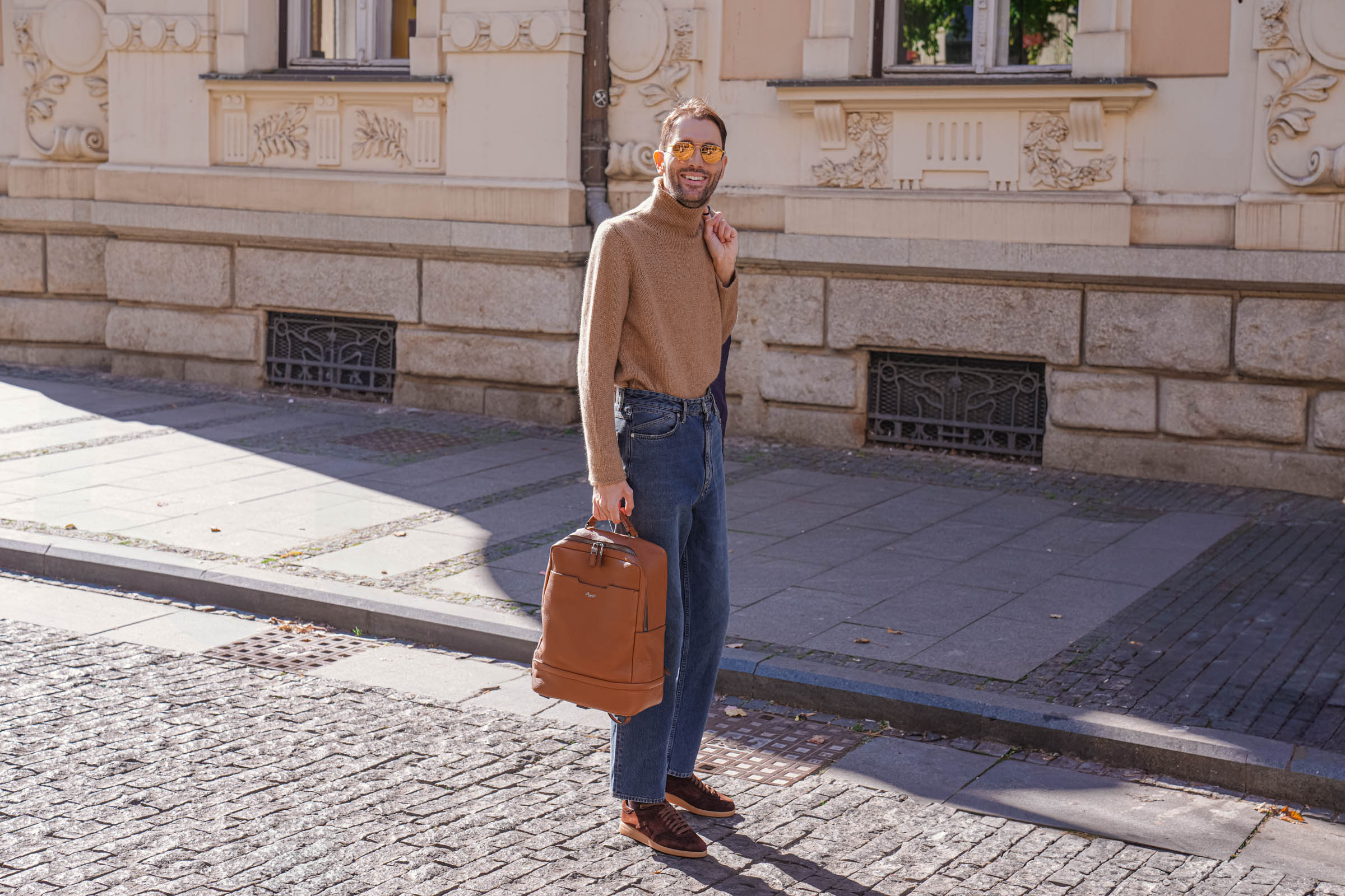 Kvalitetna kožna galanterija u usklađenim tonovima povezuje celokupan izgled. Ranac i futrola za pasoš u istoj nijansi stvaraju utisak sofisticiranog stila.