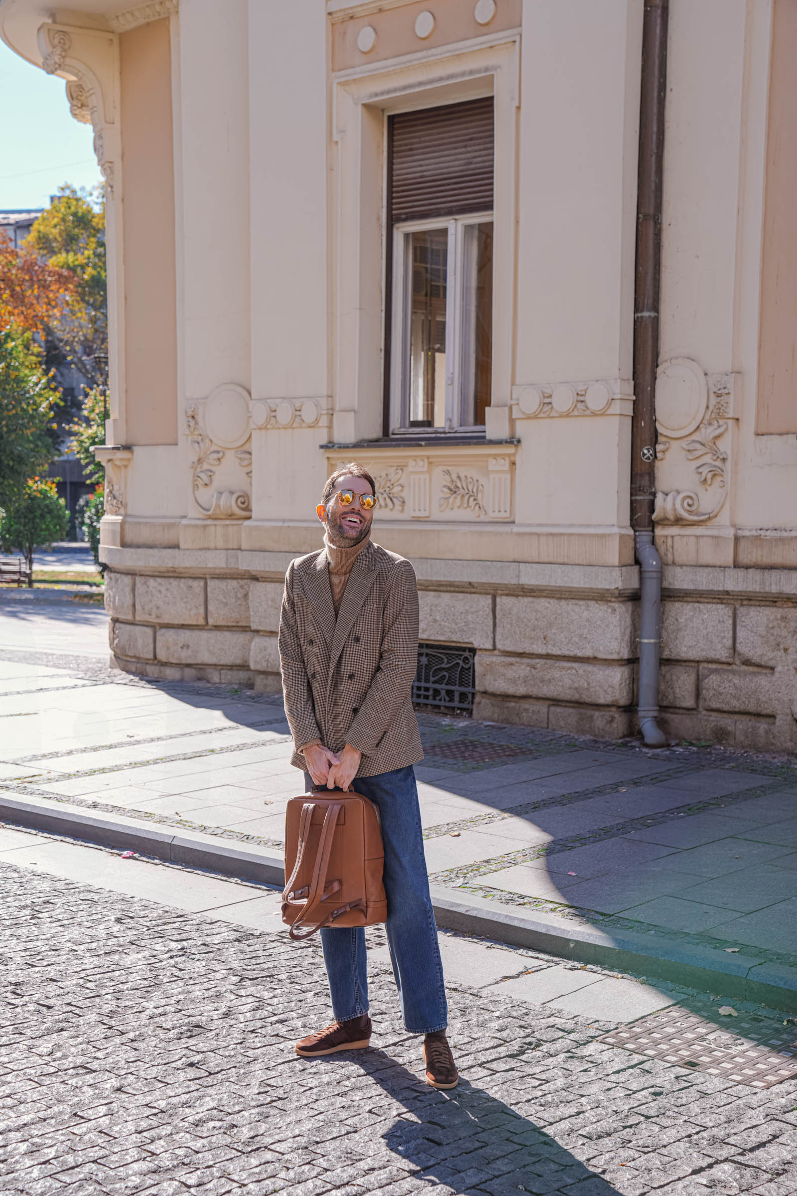 Kompletan izgled upotpunjujem kožnim rancem i futrolom za pasoš od brenda Pineider iz njihove kolekcije sa zrnastom teksturom kože. Ova firentinska kuća ima istoriju koja seže duboko u 18. vek i predstavlja pravi biser italijanskog zanatstva.